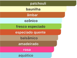 Notas de Fundo são: Patchouli, Baunilha de Bourbon e Âmbar Cizento.