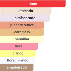 Notas de Fundo são: Baunilha, Almíscar, Sândalo, Caramelo, Patchouli e Violeta.