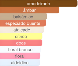 Notas de Fundo são: Âmbar, Sândalo, Benjoim, Musgo de Carvalho, Baunilha, Patchouli e Almíscar.